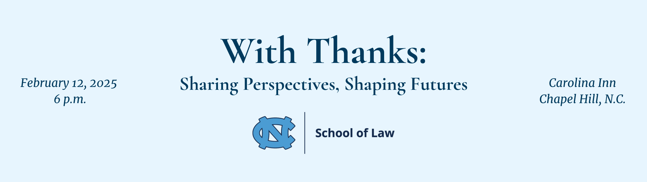 In recognition of your generous support of UNC School of Law, join us for a special dinner on Thursday, February 12 at 6:00 p.m. to celebrate your impact and engage in meaningful conversation about how philanthropy is shaping the future of Carolina Law.